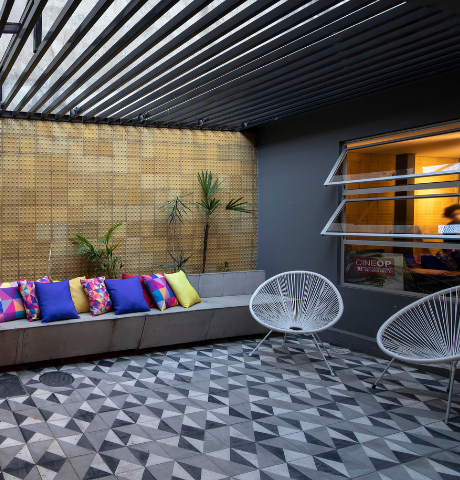 Uma área de convívio ao ar livre logo na sua chegada. Um espaço para receber você.